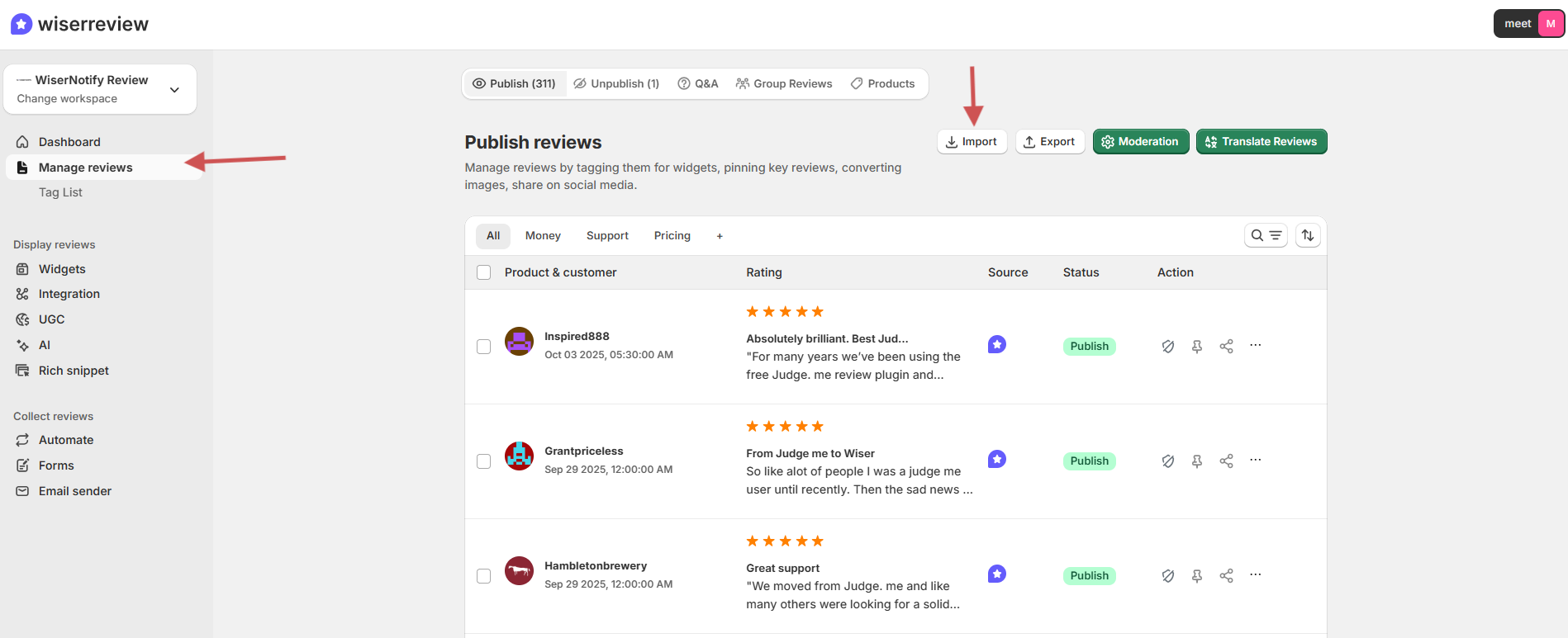 WiserReview allows you to easily import reviews from Stamped.io using a CSV file. You can organize them with tags, moderate them automatically, and display them across your website using customizable layouts, all without complicated setup.