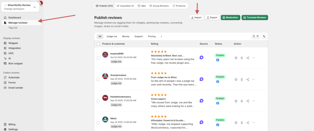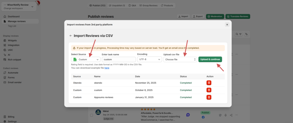 You can import reviews using the WiserReview module. Just upload a CSV or Excel file, map the fields, and click import. It’s fast and doesn’t need technical skills.