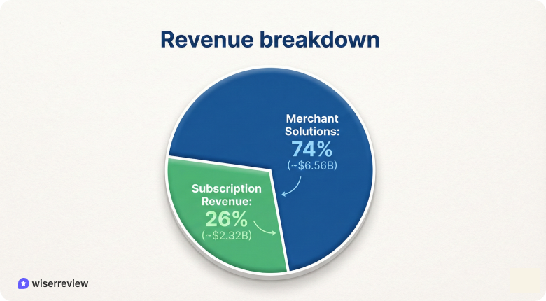 The company earns most of its revenue from subscriptions and merchant services, with payments playing a key role.