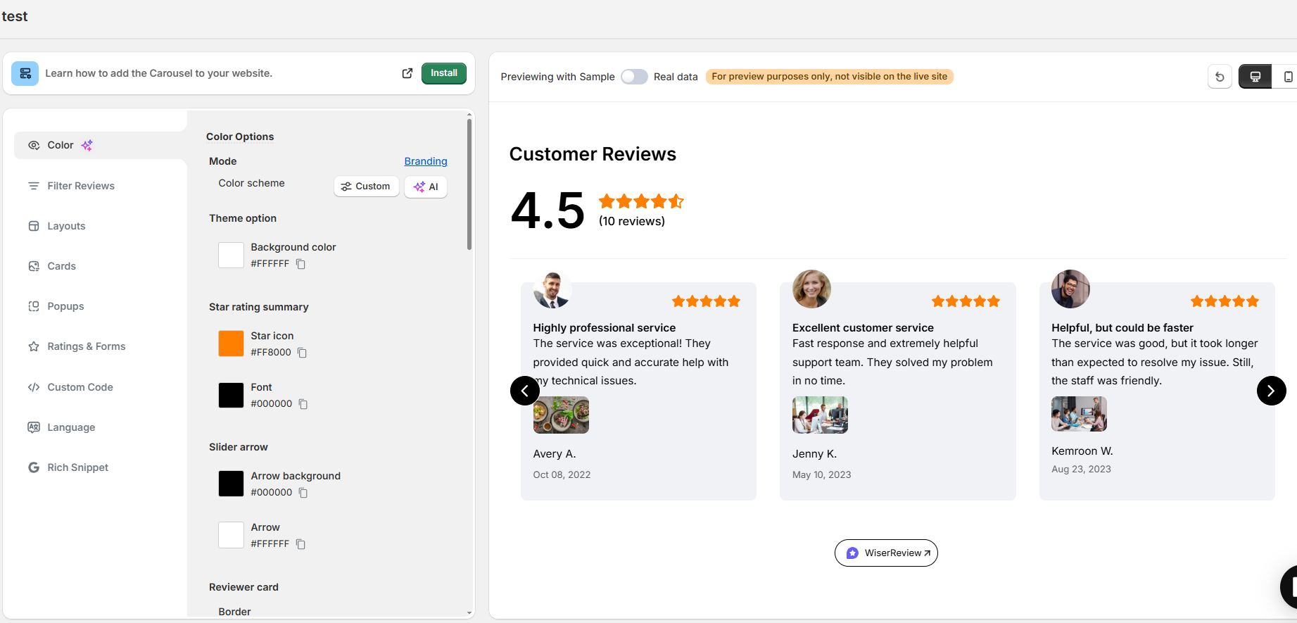3. Customize font, layout, colors, and what type of reviews show (e.g., with images, by tag)