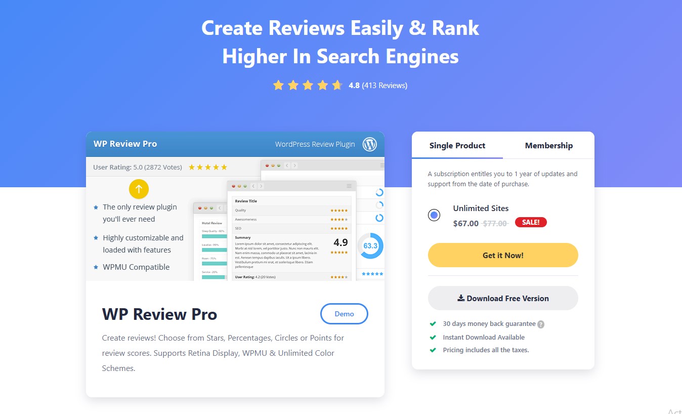WP Review Pro is a flexible review plugin (works for WooCommerce and general WordPress) that emphasizes customization, display flexibility, and review layout options. It’s especially good if you want to tailor how reviews look on your site and integrate them deeply into your design.