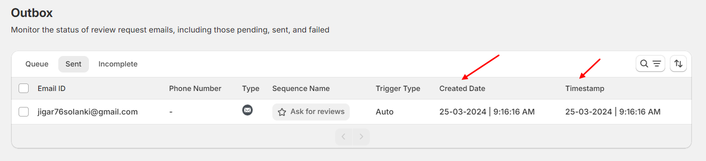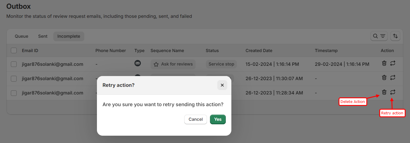 – Use action buttons (e.g., delete, retry) to manage queued, sent, or incomplete emails.