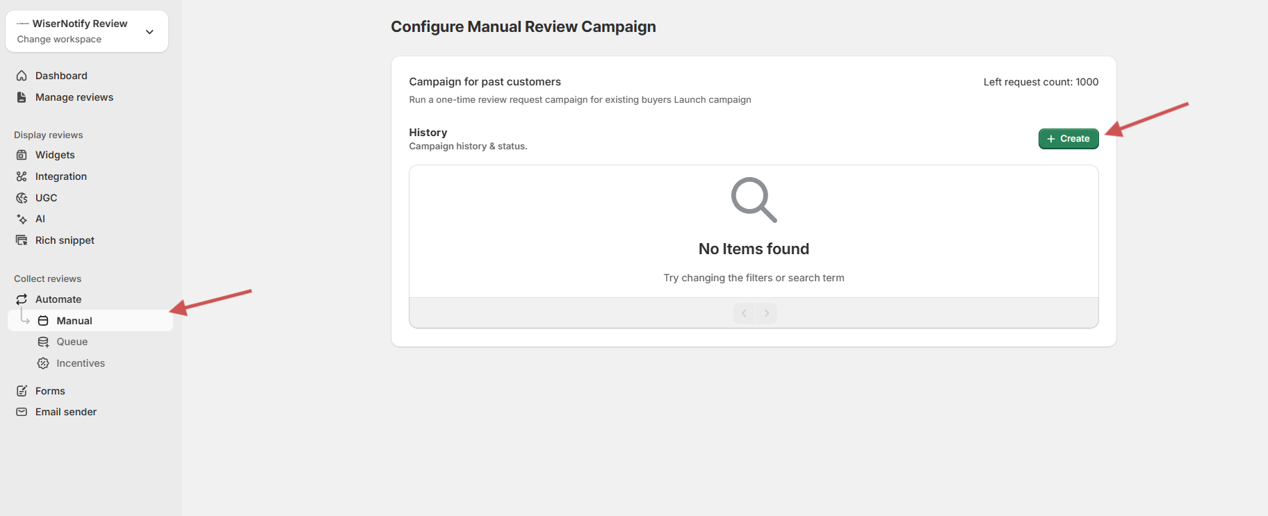 - From the WiserReview dashboard, navigate to: Collect reviews → Manual