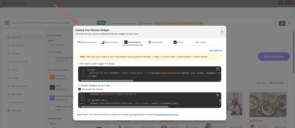 Step 3: Install the WiserReview Widget on Your Squarespace Store