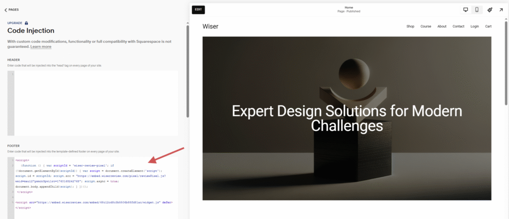 In Squarespace, go to Settings → Advanced → Code Injection → Under the Footer section, paste the WiserReview embed script.