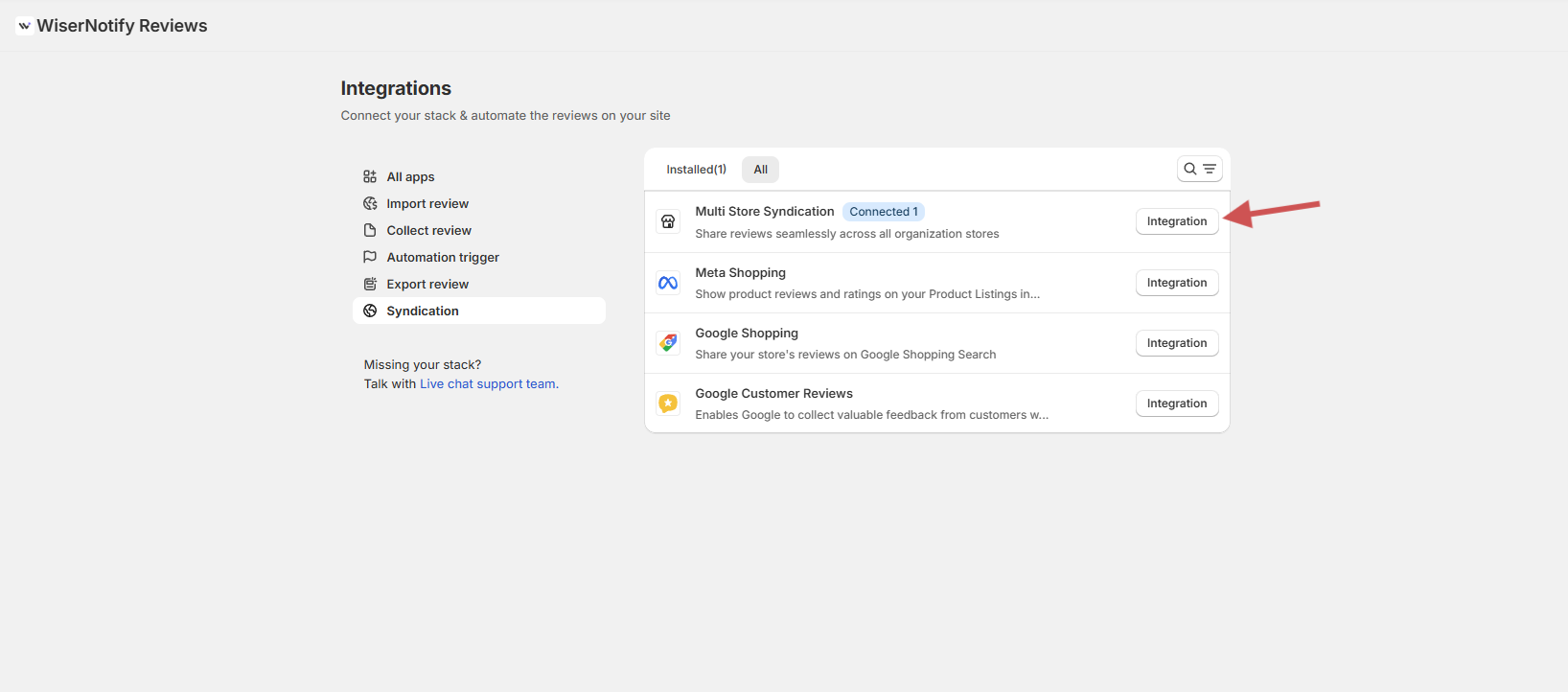 Click the Integration button next to Multi Store Syndication.