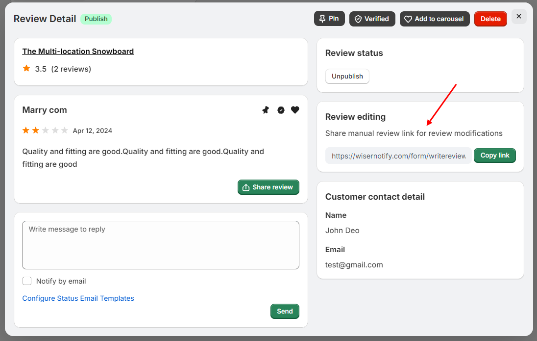 - The customer receives your email and clicks the review editing link.