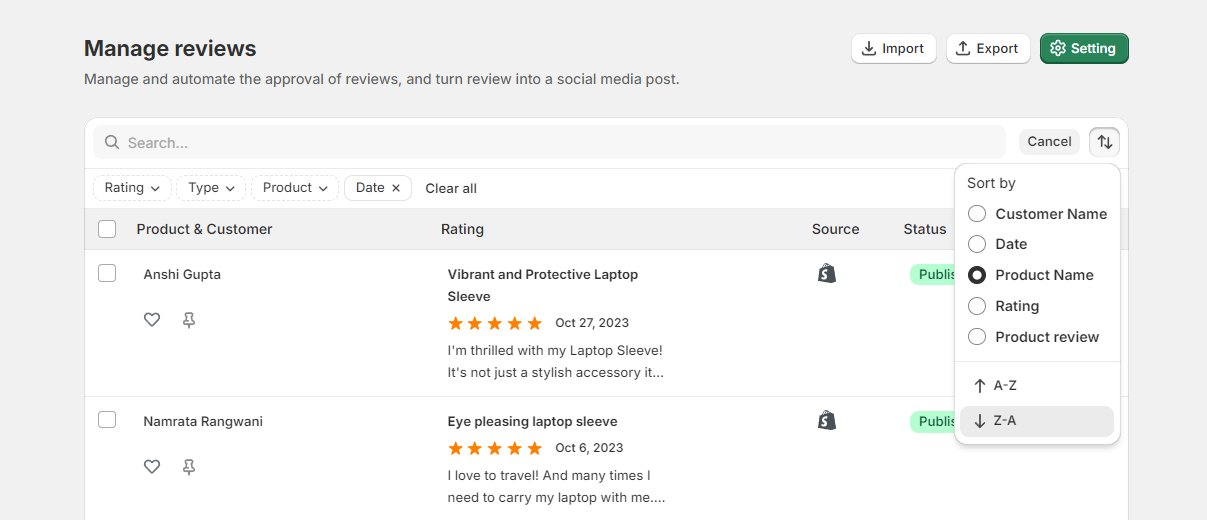 Filtering Options:  Utilize filtering options to sort reviews based on various criteria such as rating, date, product, customer name or status (approved, pending, rejected).