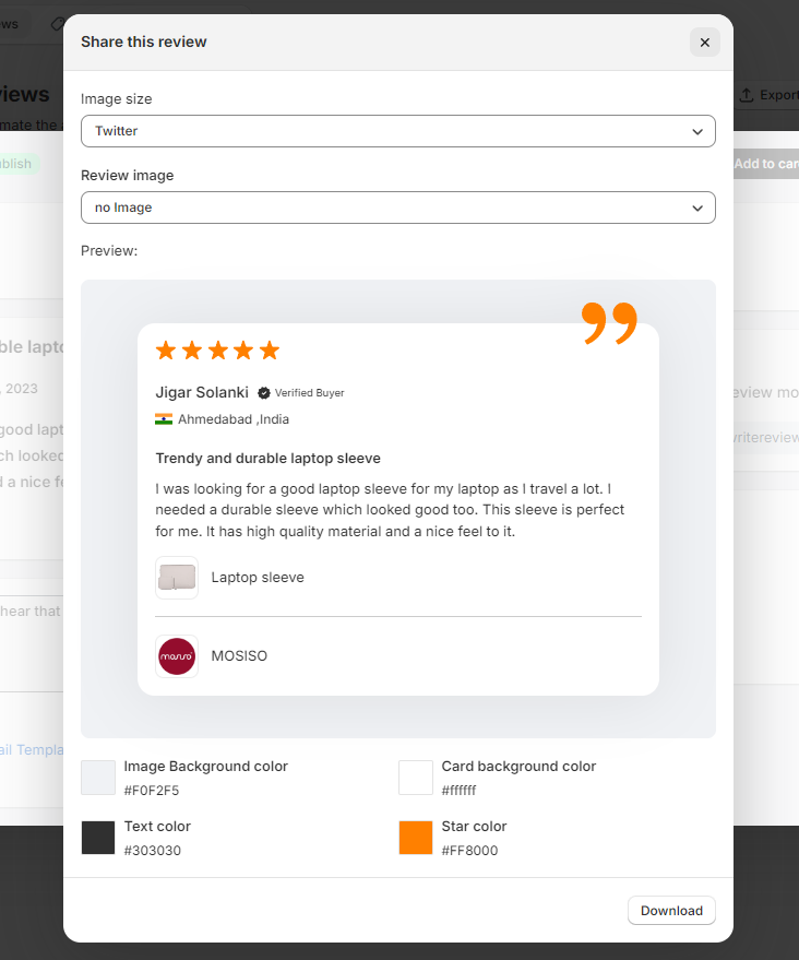• Boost your credibility by showcasing star ratings, user details, and product images.