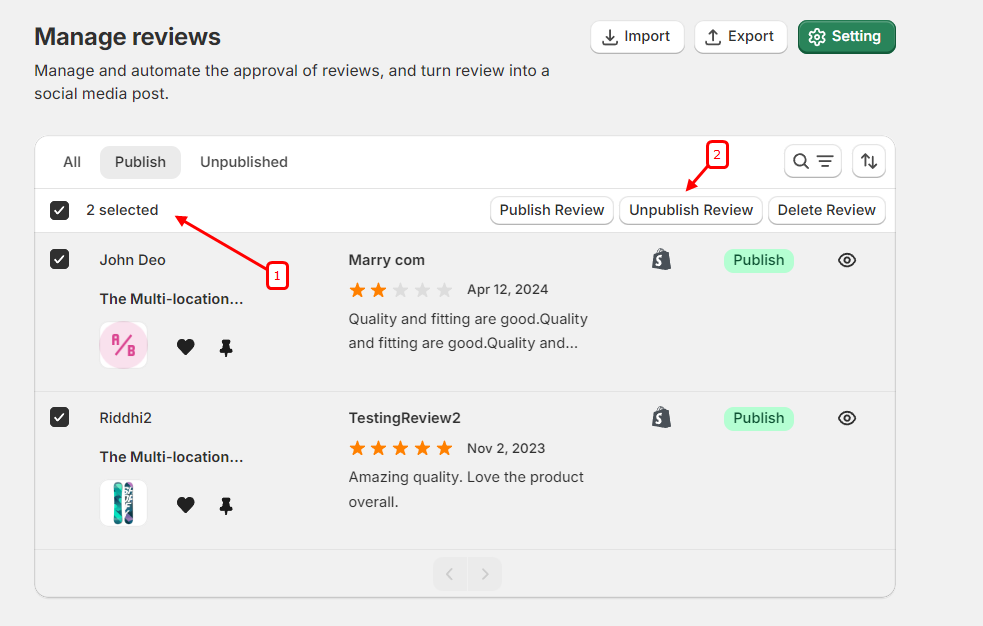 •  Select multiple reviews simultaneously using the bulk action feature. Choose to Publish, Unpublish or Reject multiple reviews in one go for efficient moderation.