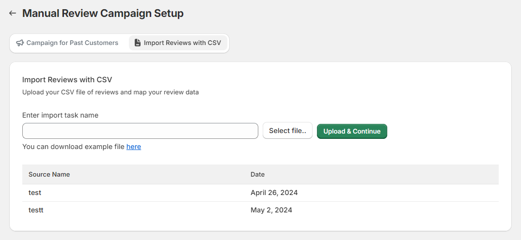 • This facilitates easy data transfer and review management.You can download an example file by clicking on the here link provided in the interface.