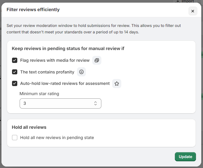 Setting: “Review Moderation Settings” feature allows users to set criteria for holding reviews in a pending status for manual review.
