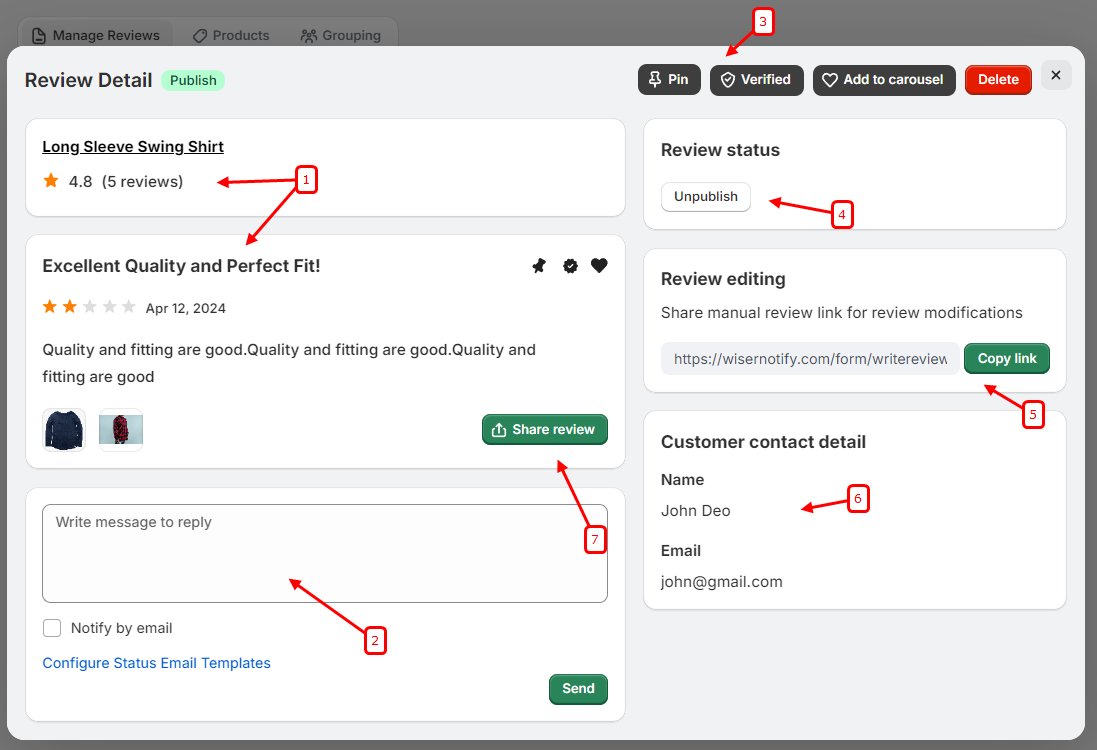 3. Pin/Verified/Add to carousel/Delete:  “Pin” button allows you to pin the review, which will display it at the top of the review list.