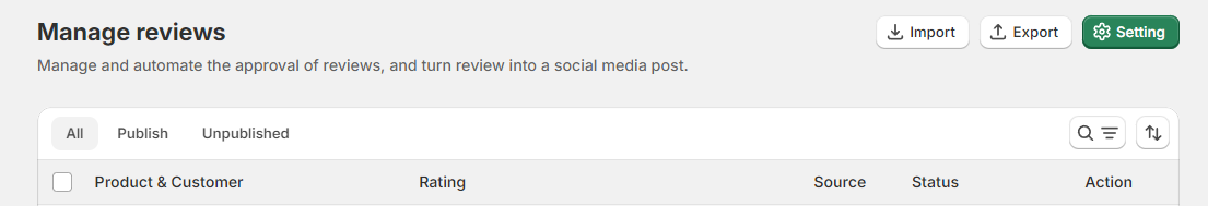 4. Publish/Unpublish:  Toggle the review’s visibility on your platform by clicking the “Publish” or “Unpublish” button.