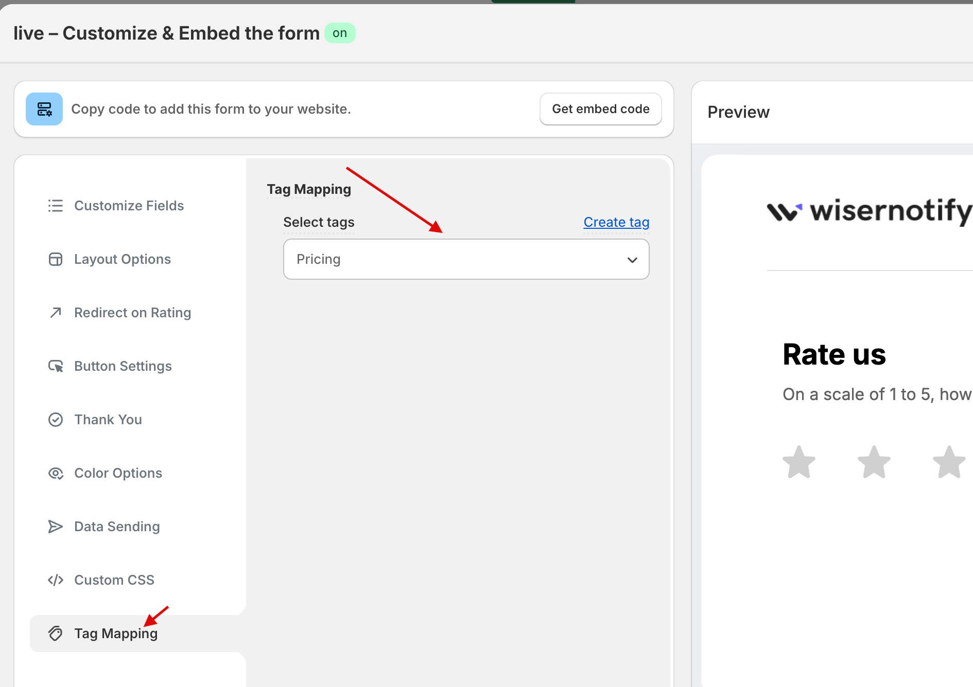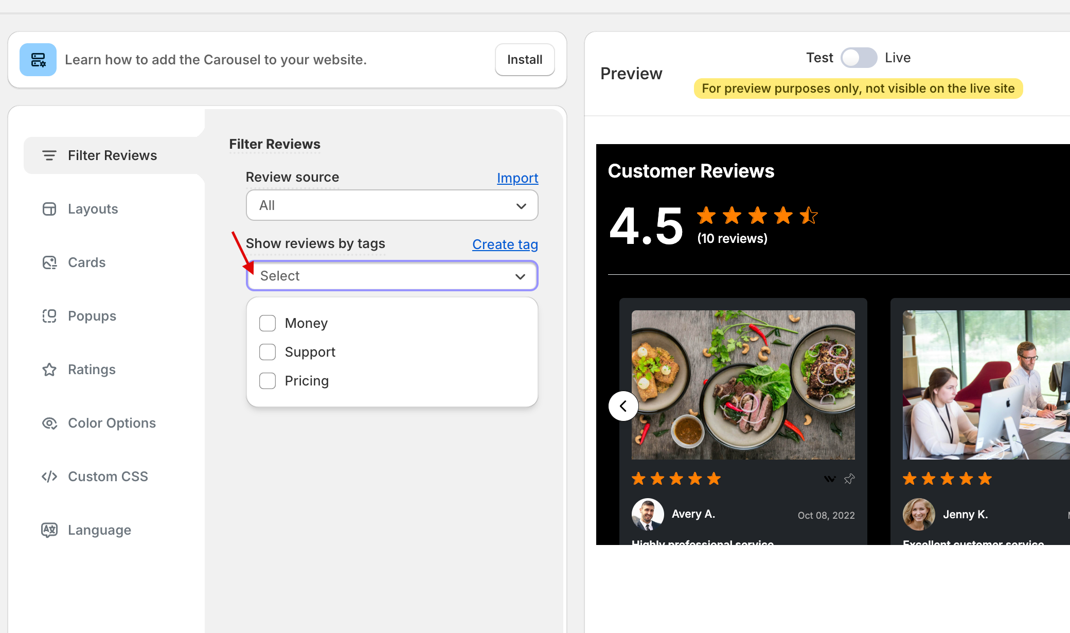 Under “Show Reviews by Tags”, select the tags to display