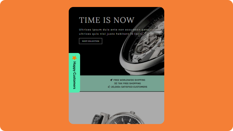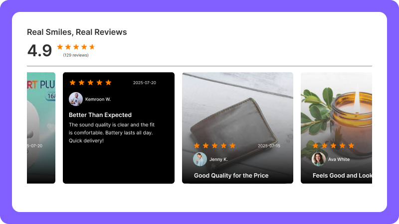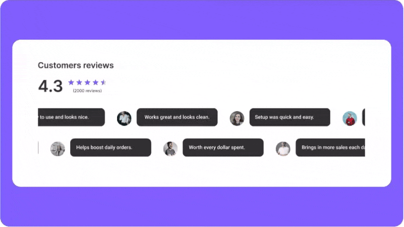 Highlight star ratings and reviews with a sleek, scrollable badge to build trust instantly.