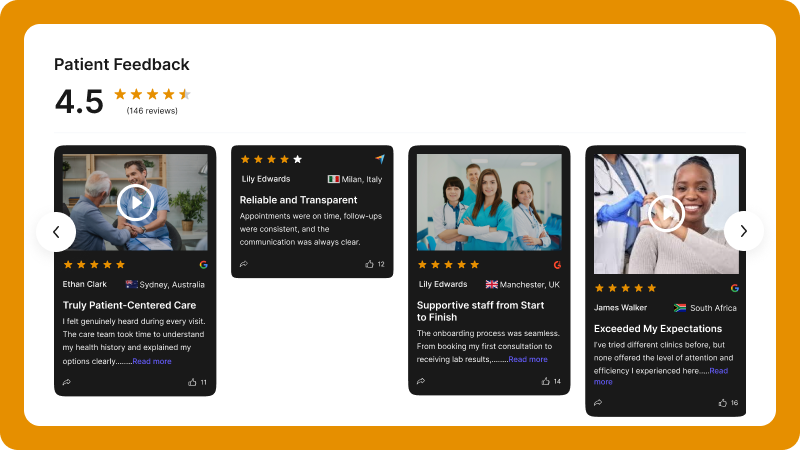 People search for reviews before selecting a provider. They trust first-person experiences more than medical bios.
