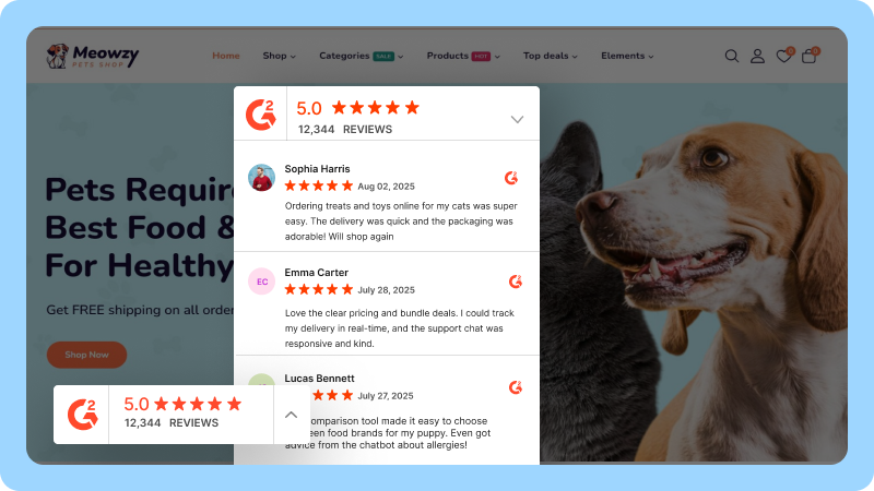 Showcase pet parents reviews in a sidebar to boost trust as users explore your site