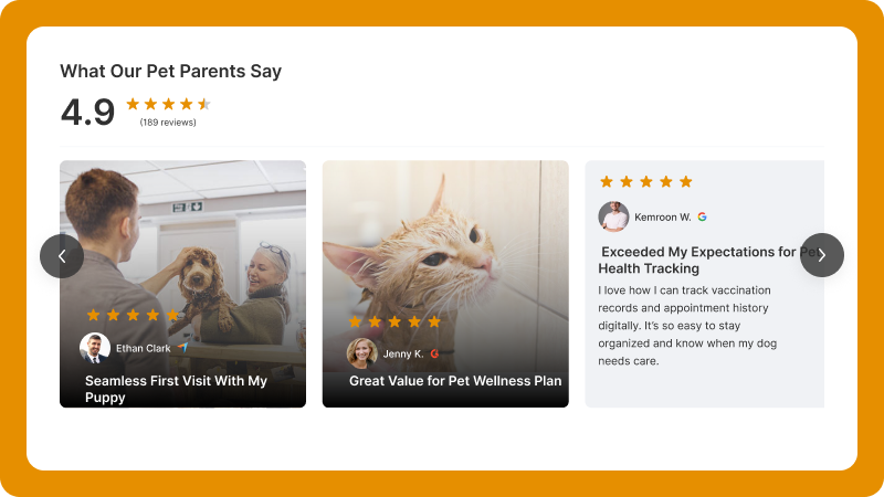 Showcase service reviews to highlight quality and build trust for both grooming and veterinary care.
